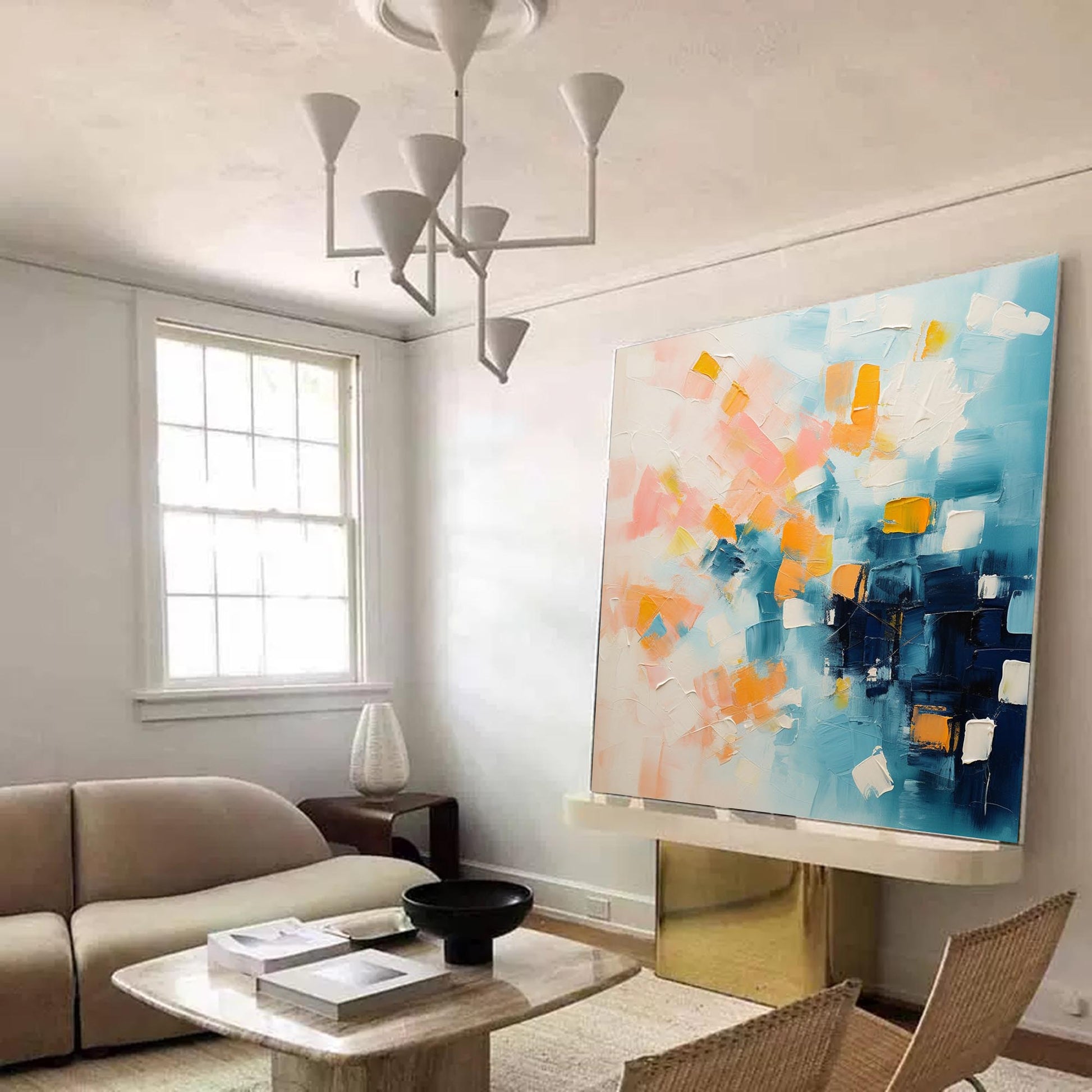 Enhance your interior with this captivating abstract oil painting that harmoniously blends soft pastel shades of pink, blue, and orange. The textured brushstrokes add depth and movement, creating an engaging visual experience. The playful use of warm and cool tones evokes feelings of lightness and calm, making it an ideal choice for bedrooms, living rooms, or offices. The abstract forms in this artwork allow for personal interpretation, inviting the viewer into a tranquil world of color and expression. Hand-painted using premium oil paints, the colors remain vibrant for years to come. Ready to hang, this artwork will bring a touch of modern elegance and serene beauty to your space.