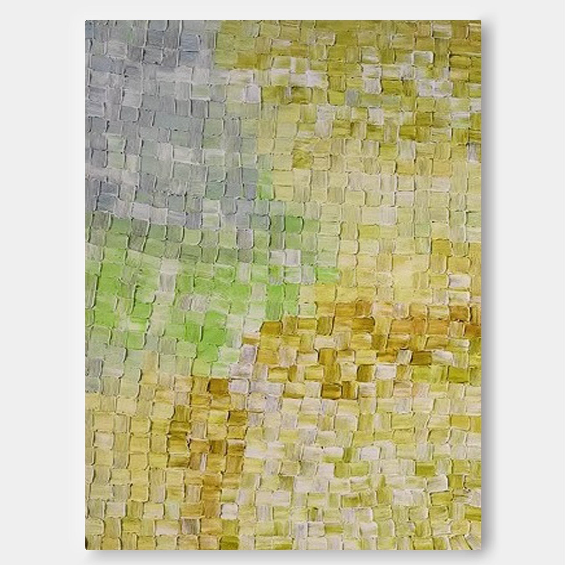 Embrace the warm glow of nature with this stunning abstract oil painting, where soft greens and golden yellows blend in a richly textured grid pattern. The painting evokes the serene beauty of a sunlit landscape, inviting feelings of peace and natural calm. Each brushstroke offers a depth of texture and a sense of movement, making this piece a perfect focal point for any space. Whether you're looking to enhance your living room, dining area, or office, this artwork will bring an earthy elegance and tranquil energy to your décor, perfect for those seeking modern, nature-inspired art.