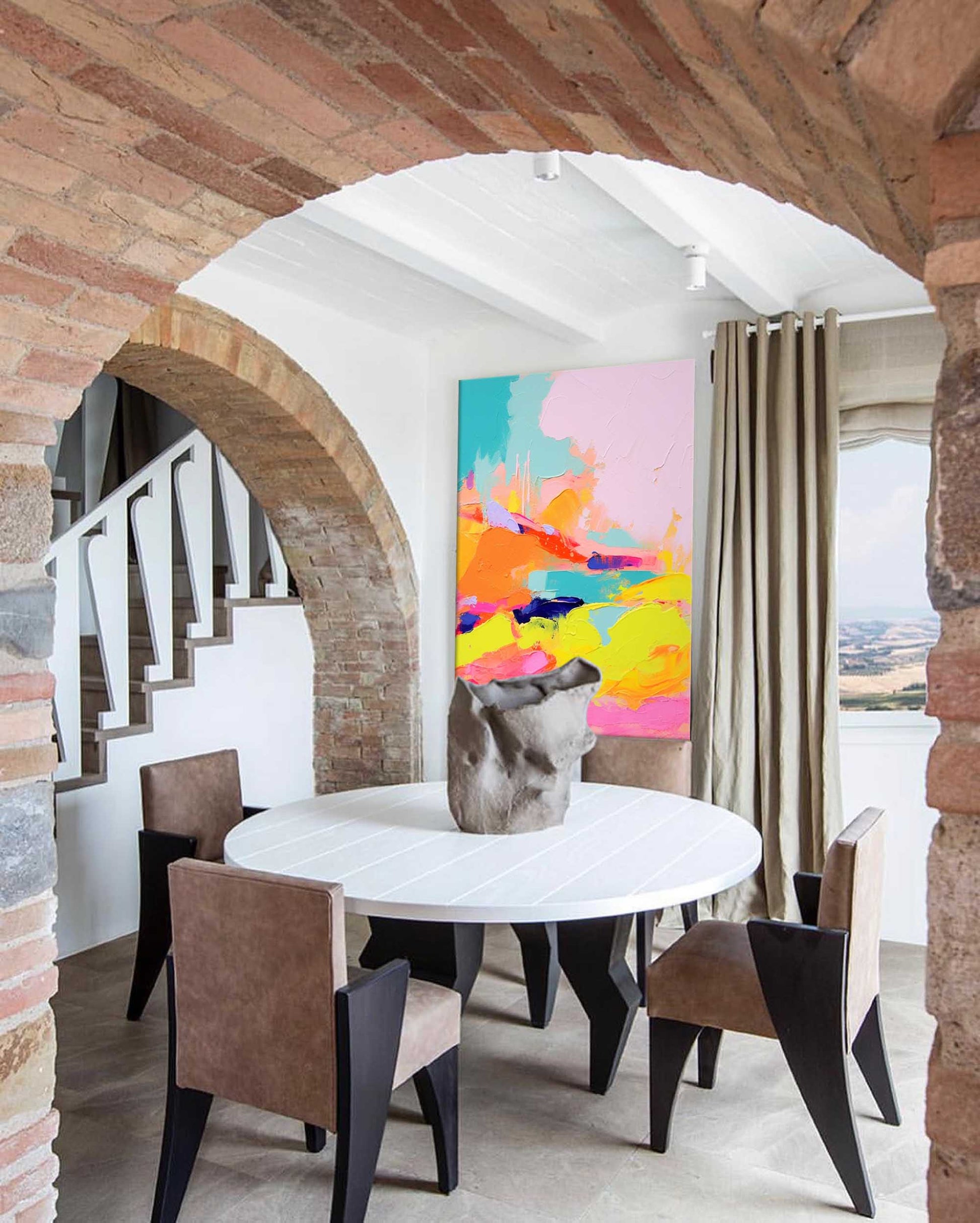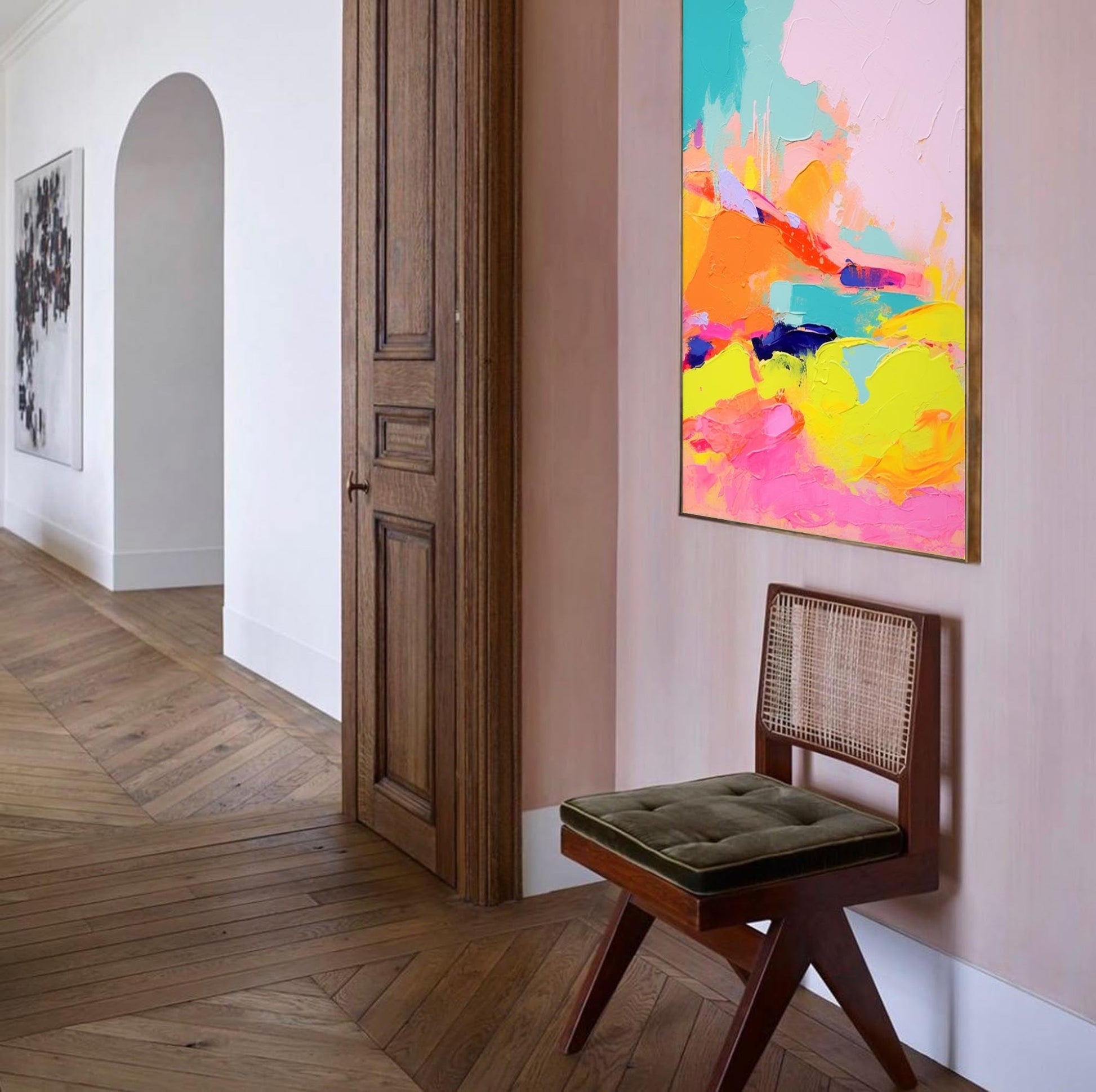 This bold and radiant abstract painting features a vibrant mix of neon pinks, yellows, oranges, and blues that blend seamlessly into an energetic, color-block composition. The expressive brushstrokes and textured layers evoke a sense of dynamic movement, creating a lively and joyful atmosphere. Perfect for modern interiors, this piece brings a splash of excitement and boldness to living spaces, creative studios, or offices. The handcrafted quality ensures that each painting is unique, making it a one-of-a-kind statement piece. Its vibrant color palette and expressive design serve as both art and inspiration, infusing any room with creativity and positivity.
