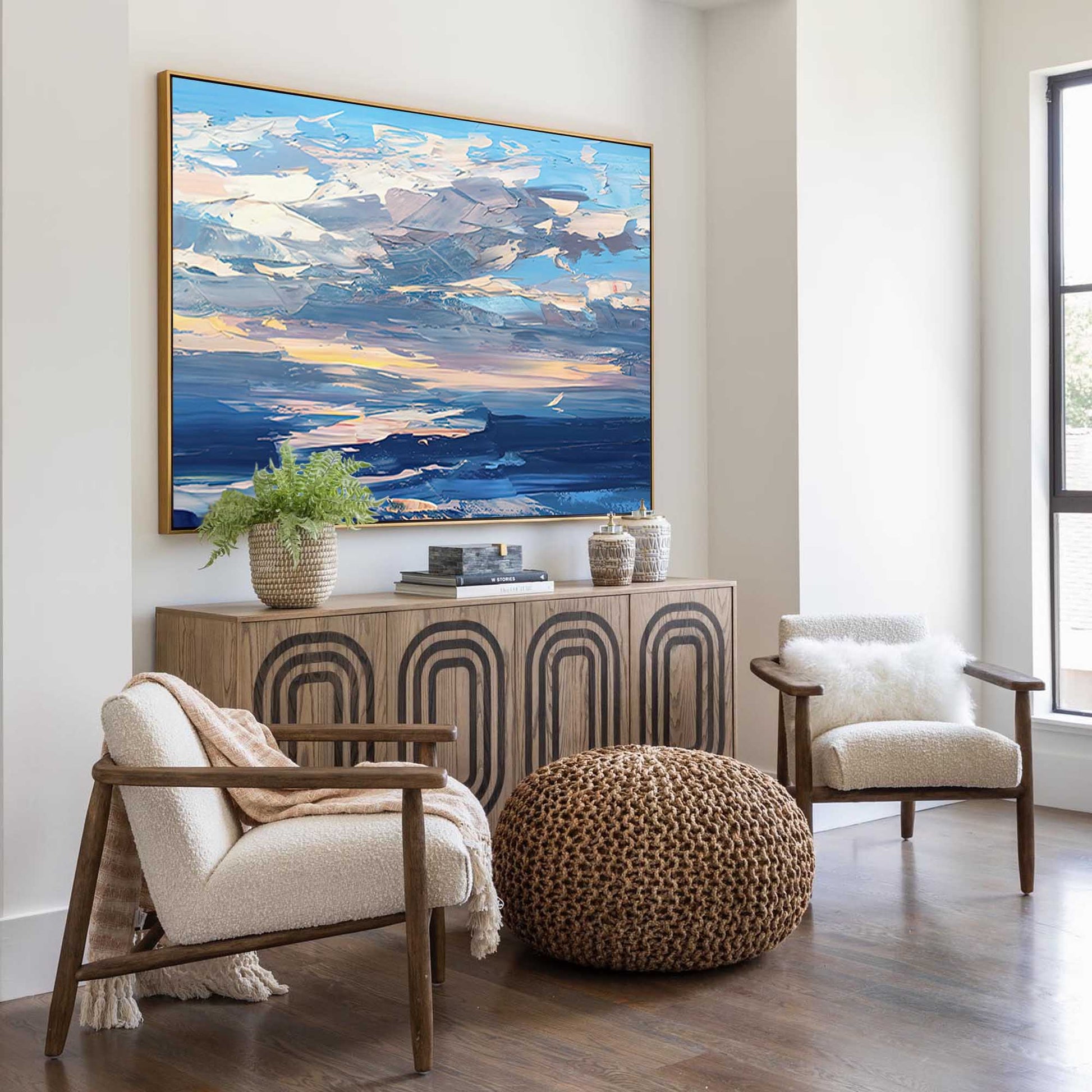 This abstract piece is perfect for adding a touch of serenity and elegance to any space, whether it be a living room, office, or gallery wall. The combination of cool tones with gentle pastels creates a calming atmosphere, ideal for contemporary and minimalist interiors. Hand-painted with care, each stroke offers a unique texture and depth, ensuring no two pieces are exactly the same. "Twilight Sky Reflections" is ready to hang and brings the peaceful allure of the twilight sky into your home.